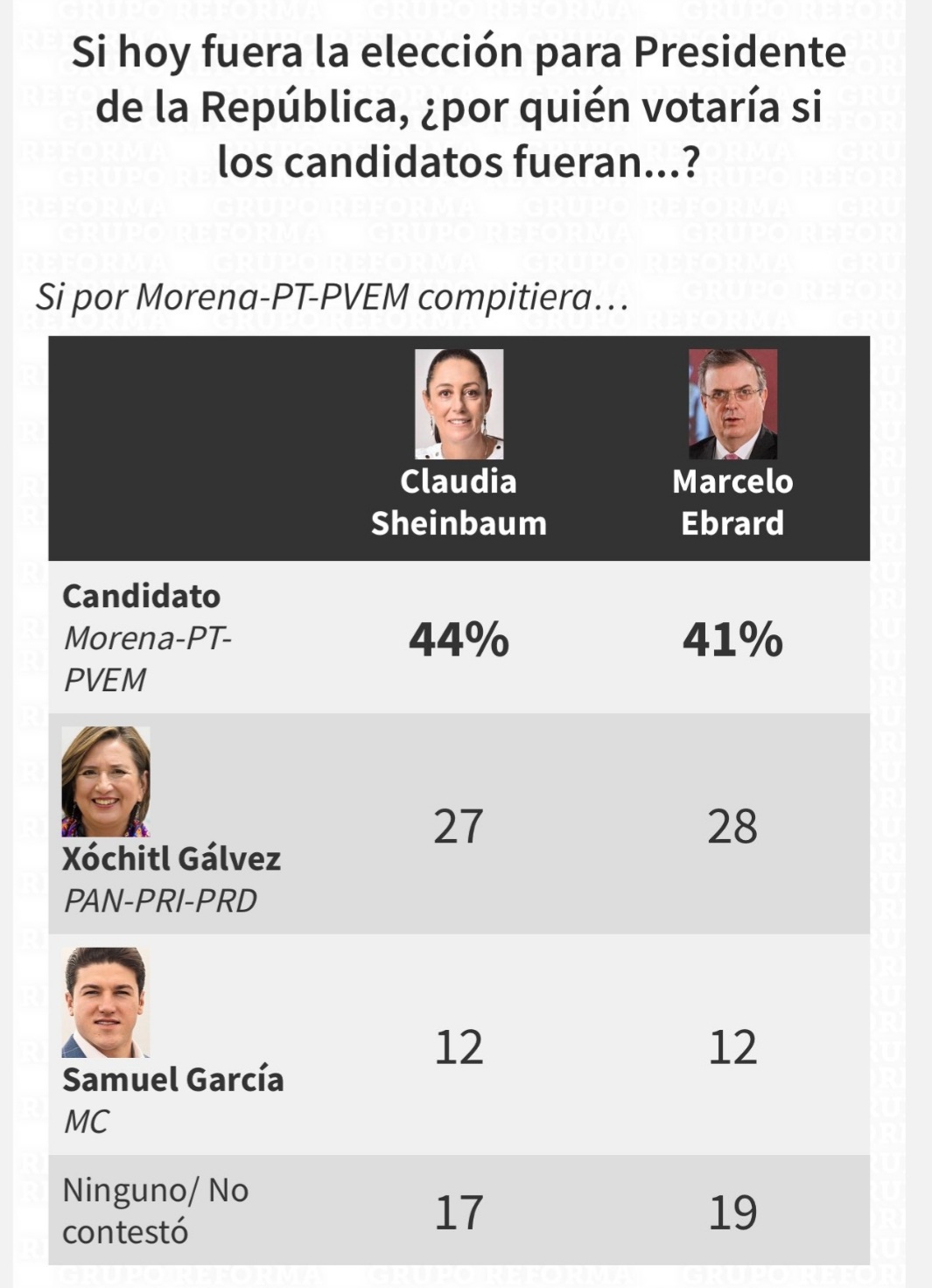 Por otra parte, Ebrard seguiría rebasando en un 41 % la intención de votos, siendo un candidato alterno al Movimiento Regeneración Nacional.