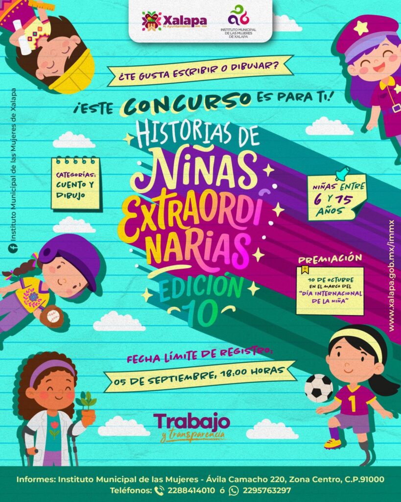 Xalapa, Veracruz; 08 de agosto de 2025. Con el objetivo de fomentar la creatividad, la participación y la inclusión social de niñas y adolescentes, el Ayuntamiento, a través del Instituto Municipal de las Mujeres de Xalapa (IMMX), convoca a la décima edición del concurso de cuento y dibujo “Historias de Niñas Extraordinarias”.