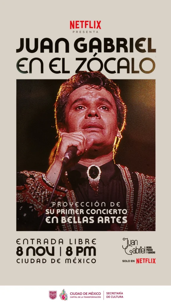 Ciudad de México; 21 de octubre de 2025. El icónico concierto que Juan Gabriel ofreció en el Palacio de Bellas Artes en 1990 será proyectado el próximo 8 de noviembre en la plaza del Zócalo de la Ciudad de México como parte de un homenaje gratuito organizado por Netflix y la Secretaría de Cultura de la capital.