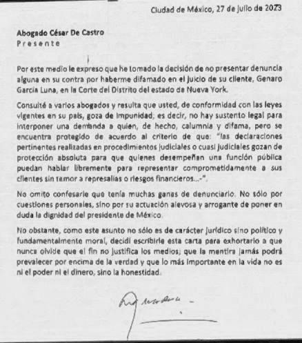 “Por este medio le expreso que he tomado la decisión de no presentar denuncia alguna en su contra por haberme difamado en el juicio de su cliente, Genaro García Luna, en la Corte del Distrito del estado de Nueva York. Consulté a varios abogados y resulta que usted, de conformidad con las leyes vigentes en su país, goza de impunidad; es decir, no hay sustento legal para interponer una demanda a quien, de hecho, calumnia y difama, pero se encuentra protegido de acuerdo al criterio de que: ‘las declaraciones pertinentes realizadas en procedimientos judiciales o cuasi judiciales gozan de protección absoluta para que quienes desempeñan una función pública puedan hablar libremente para representar comprometidamente a sus clientes sin temor a represalias o riesgos financieros”, compartió el presidente.
