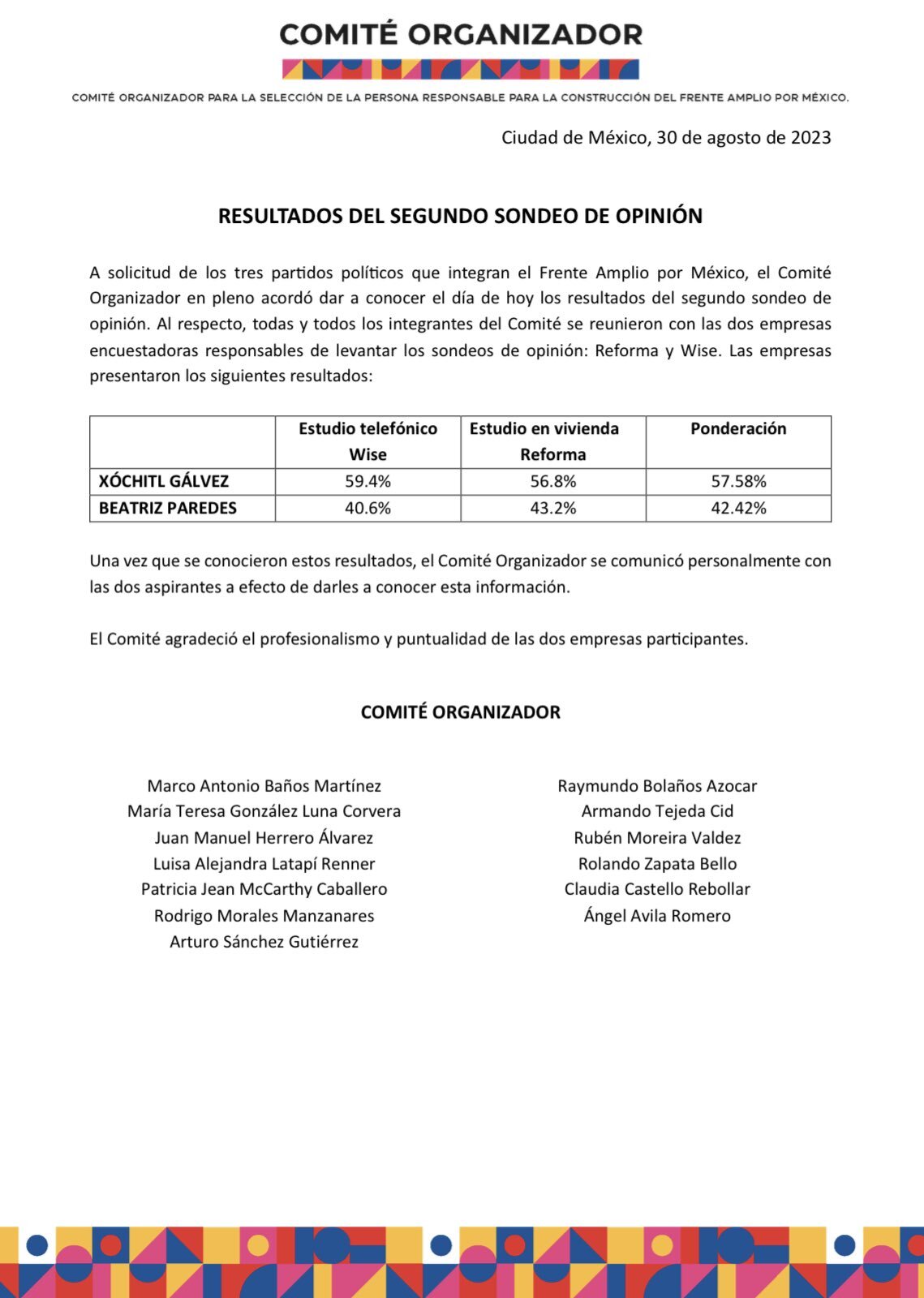 Fue a través de Twitter que Frente Amplio por México dio a conocer el resultado de la solicitud interpuesta por los tres partidos políticos que lo conforman, en donde Xóchitl Gálvez obtuvo el primer lugar con una ponderación del 57.58 %, mientras que Beatriz Paredes, un 42.42 %.